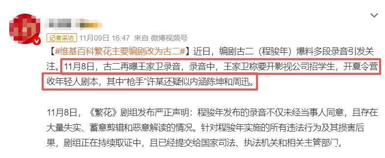 就在11月8号的时候,那个小职员再次曝光了一段录音,事情牵扯到的人还在增多,这次是内容是“墨镜”想开一家影视公司招学生,营收那些年轻人的剧本。
