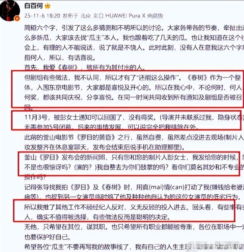 首先就是她说自己被《春树》的剧组所“背刺”,明明是一个整体被邀请到了国外电影节,可活动才刚开始就让她这个女主角回国。